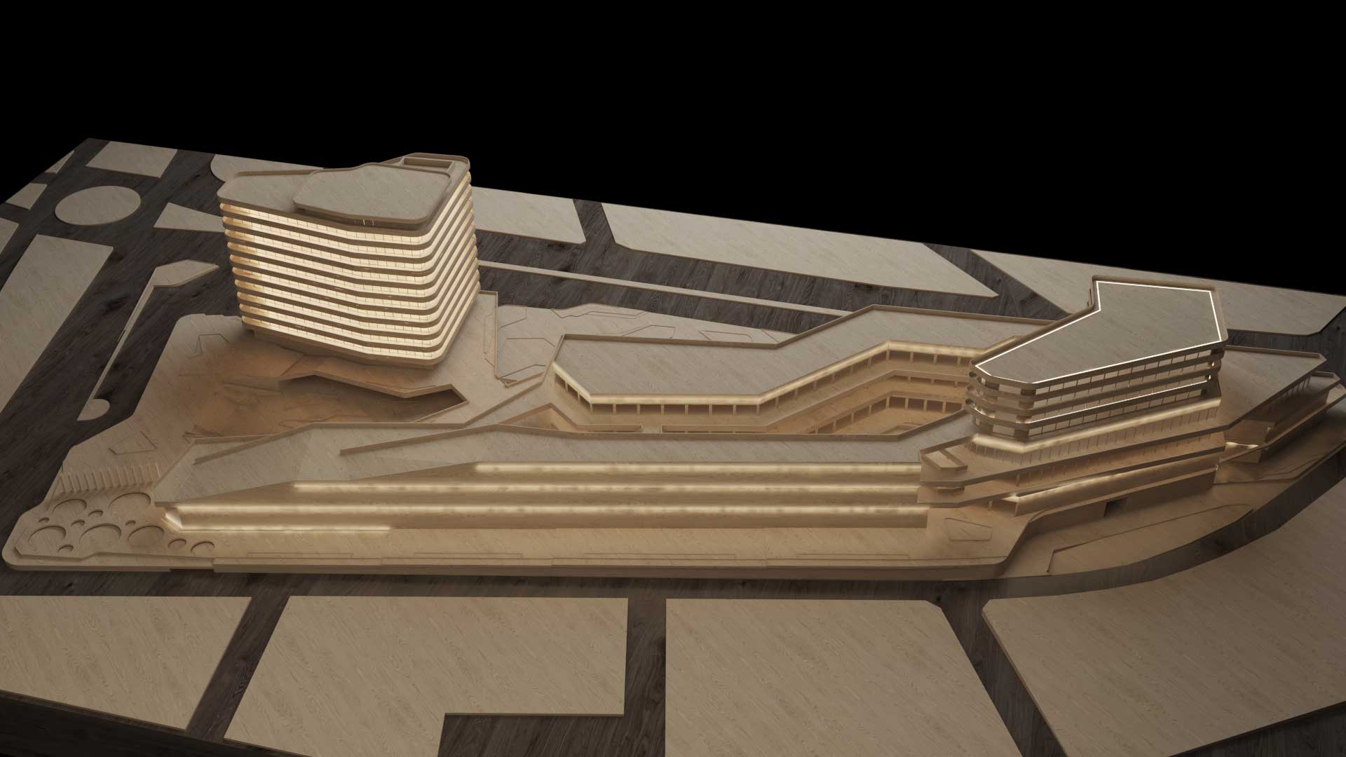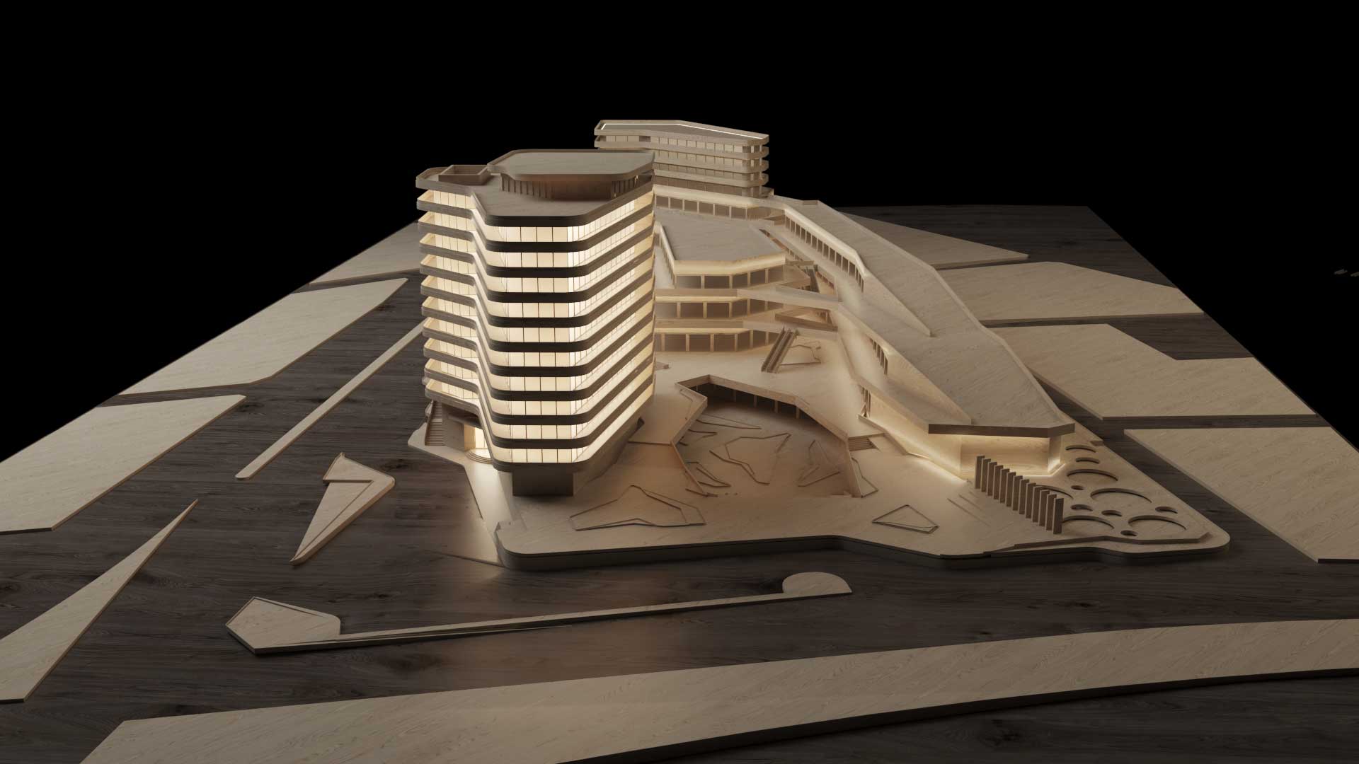 The mall podium unfolds across terraced levels, embracing the landscape and shaping an inviting public plaza. Warm-toned stone cladding, textured concrete surfaces, and reflective glazing establish a contemporary yet natural material palette. At night, integrated architectural lighting emphasizes stairs, bridges, and façades, enhancing both safety and spatial character.