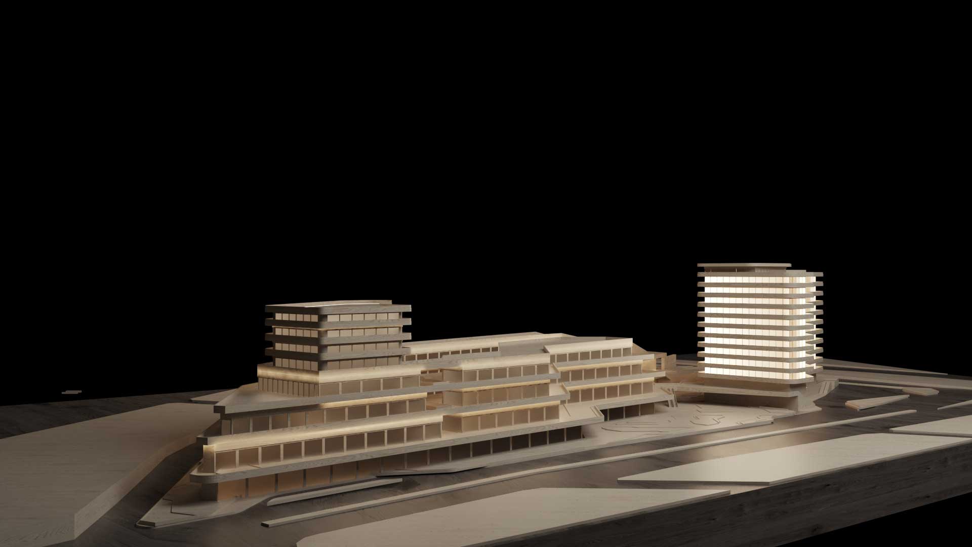A central courtyard functions as an active urban core, incorporating trees, seating areas, and amphitheater-like steps for social interaction. The hotel connects seamlessly with the retail and plaza zones, encouraging interaction between commercial and hospitality programs while maintaining clear spatial hierarchy.