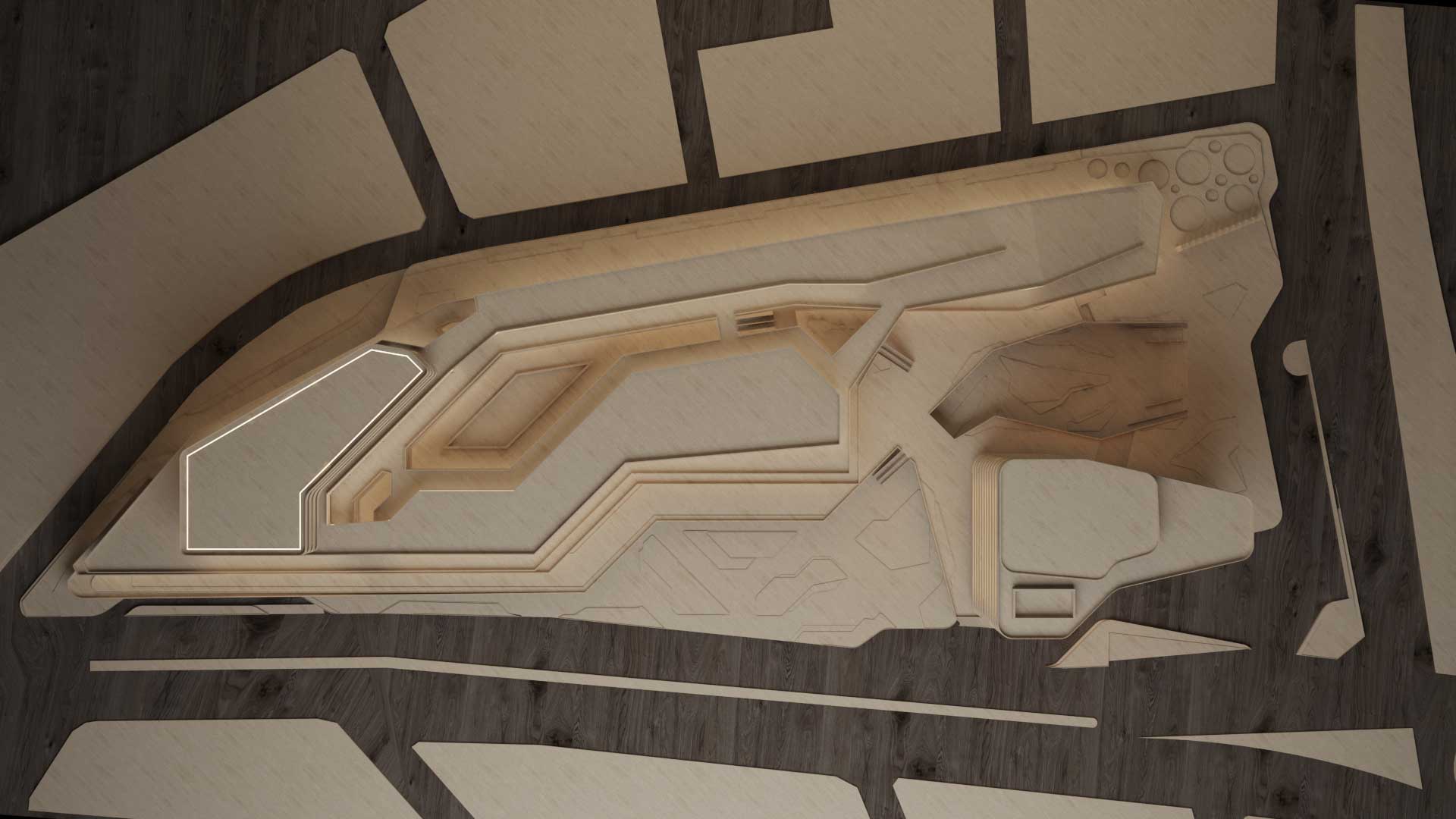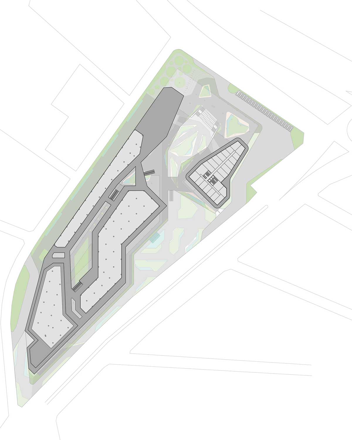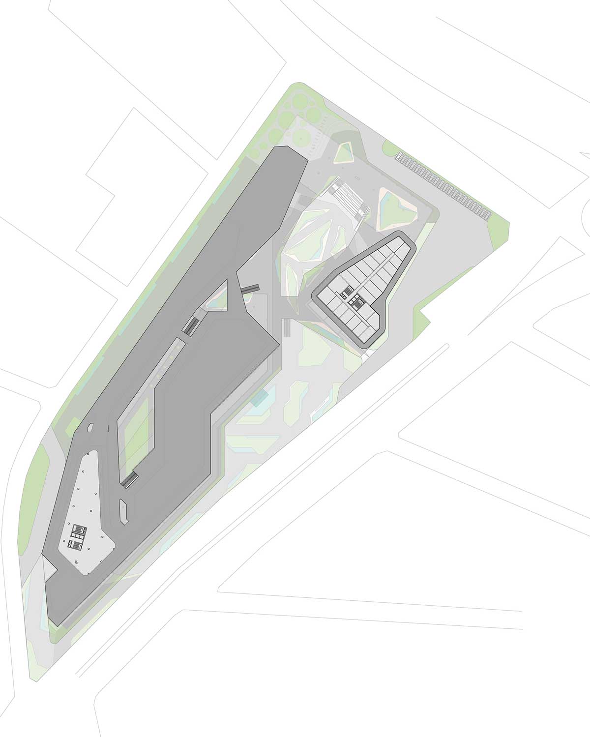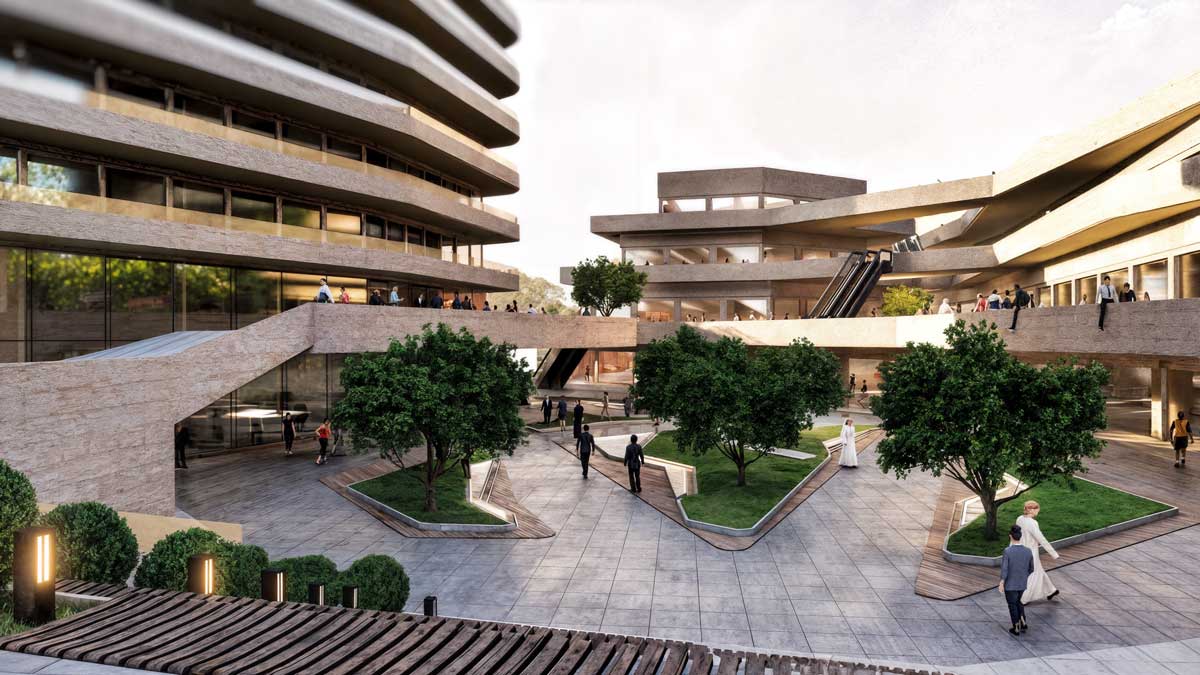 The masterplan responds directly to the site’s topography, shaping the buildings in a linear yet sculptural configuration that maximizes daylight, visual permeability, and spatial connectivity. Rather than imposing a single monolithic volume, the project unfolds across the landscape through a sequence of terraces and platforms.