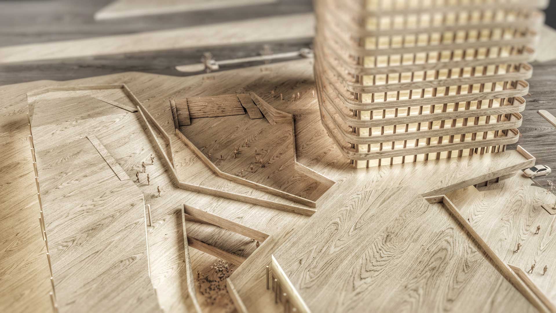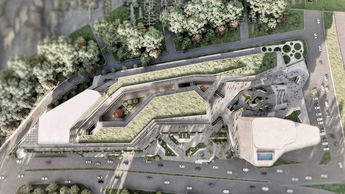 A network of pedestrian ramps, elevated walkways, and landscaped decks weaves through the development, linking the shopping mall, hotel, and open plazas into one continuous flow. Green roofs and stepped outdoor spaces extend the natural ground plane vertically, reinforcing the connection between architecture and terrain.