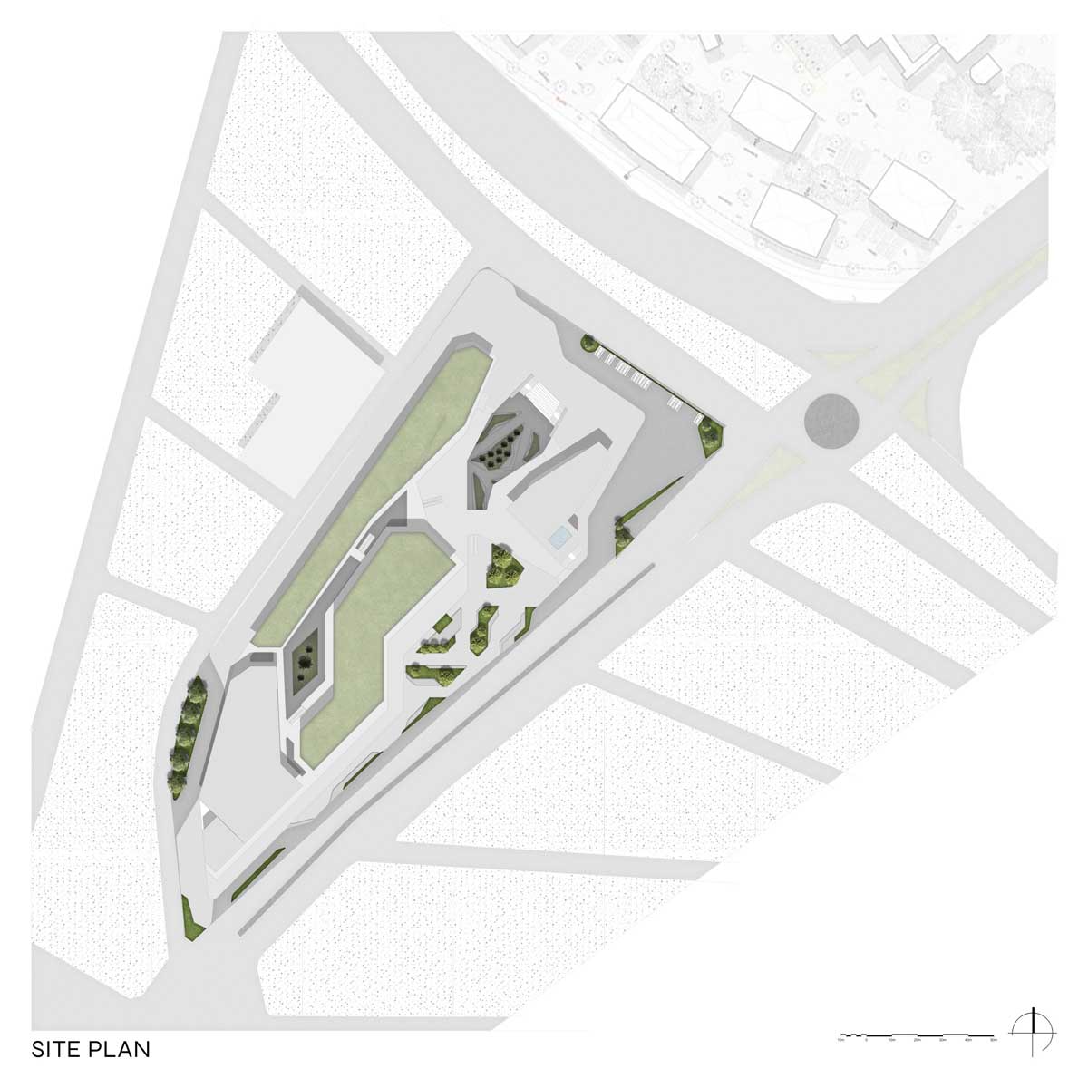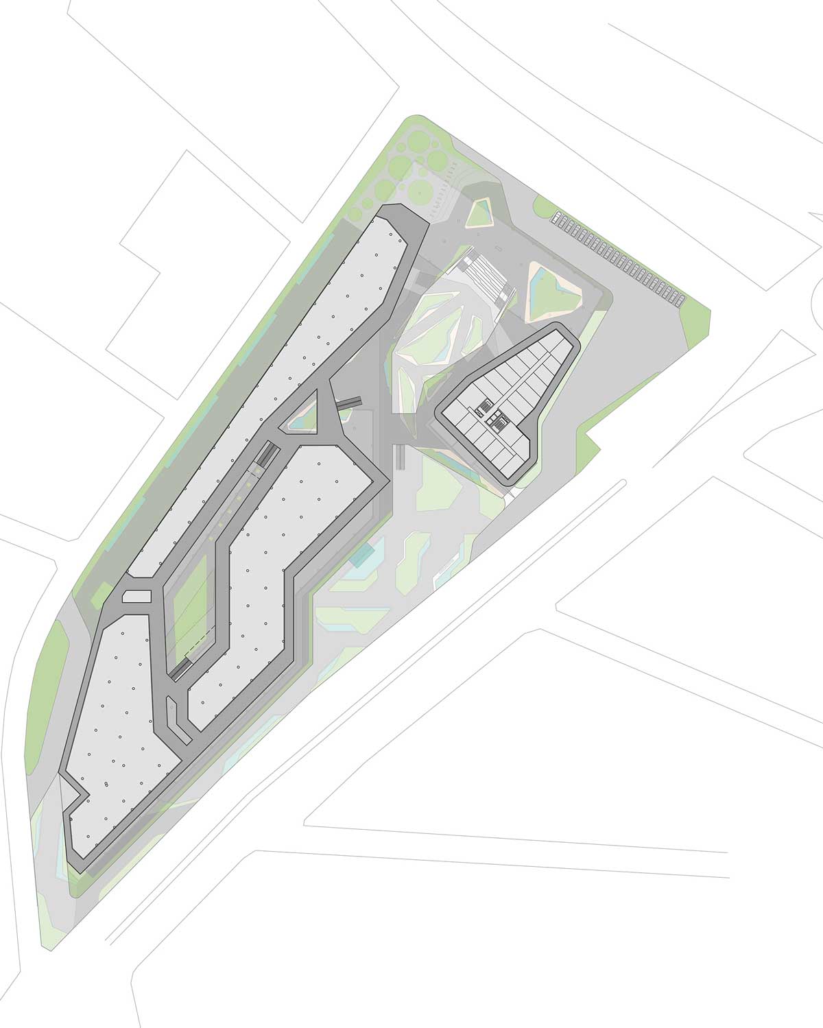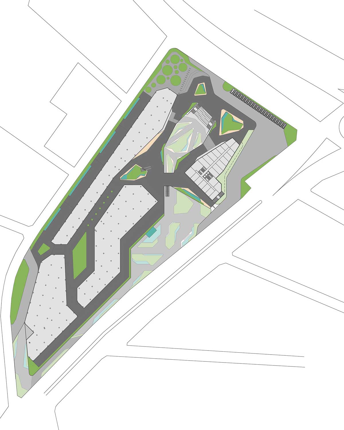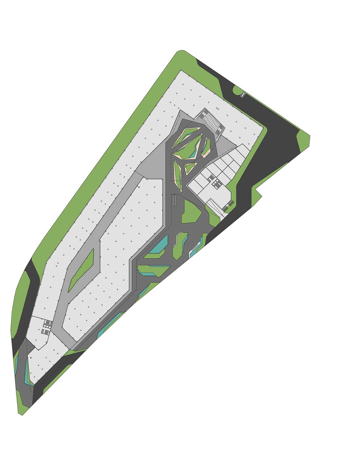 Natural ventilation strategies and optimized daylight penetration minimize energy consumption throughout the complex. Shaded walkways, vegetation, and landscape elements generate a comfortable microclimate, while efficient circulation zoning separates pedestrian, service, and vehicular access to ensure smooth operation and safety.